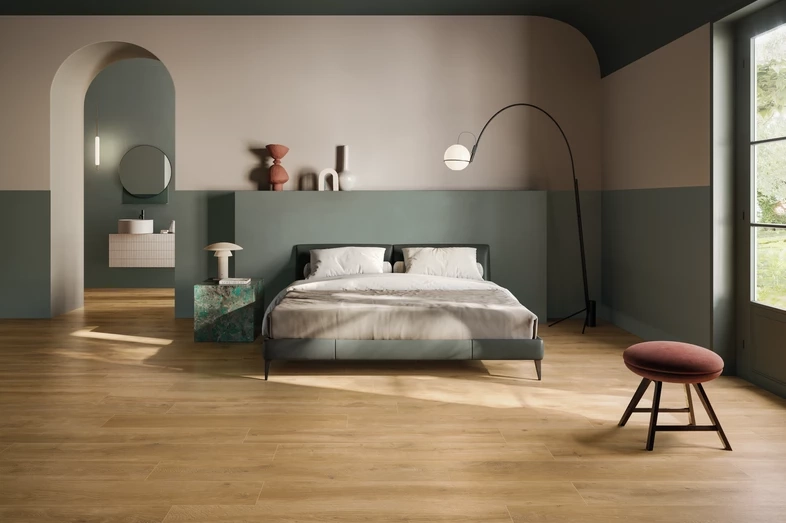 • Le carrelage aspect bois : Pour retrouver toute la chaleur du parquet sans les contraintes d'entretien. Idéal pour une chambre parentale cosy.