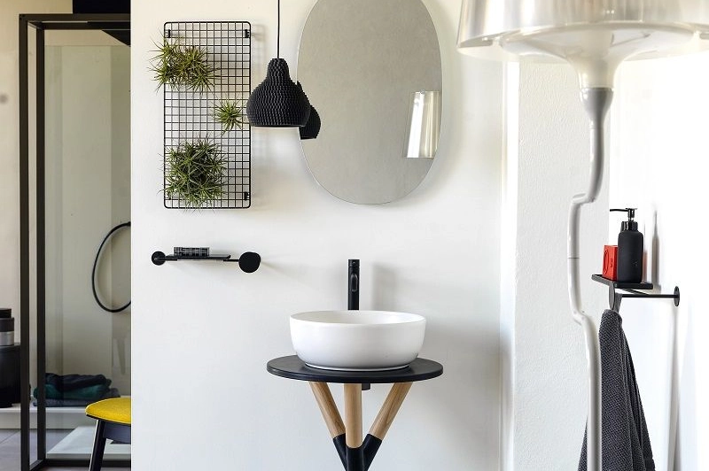 Une gamme d’accessoires coordonnés : miroirs, porte-serviettes, étagères, porte gobelet, achève l’embellissement de la pièce avec style et élégance.