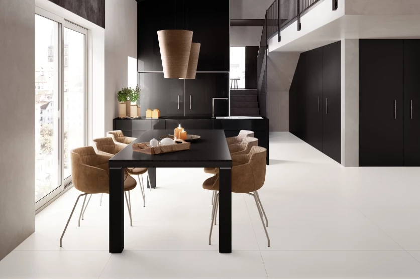 Le carrelage poli blanc et noir reflète la lumière, ajoutant éclat et profondeur à la pièce.