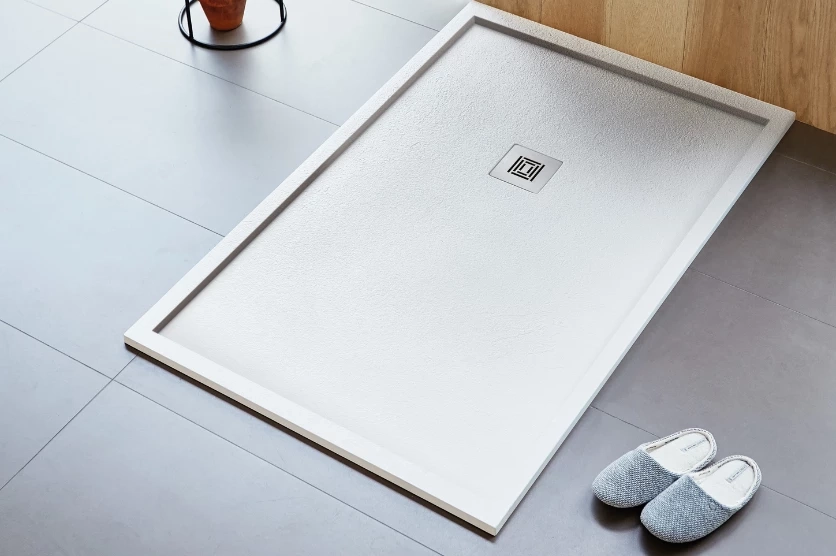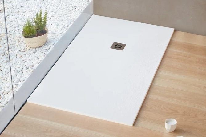 Receveur de douche Logic recoupable sur mesure avec grille d'évacuation en inox, finition Blanc mat aspect ardoise. Disponible en version avec rebord.